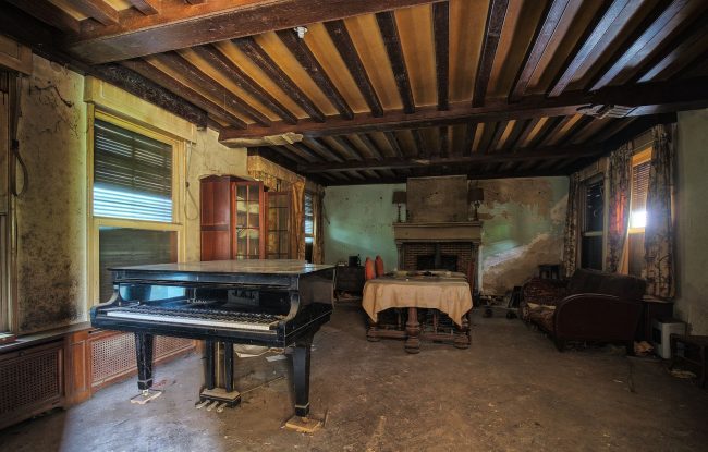This abandoned manor is located in a quiet area, it has a large garden with many roses and a pond with geese, which are still fed by the neighbour. Back in the days it was inhabited by a lawyer. Inside it was dark, moldy and the stairs above were rotten. The lawyer had 2 pianos. We expected more of this location, we didn’t take many shots but it was a nice short adventure.