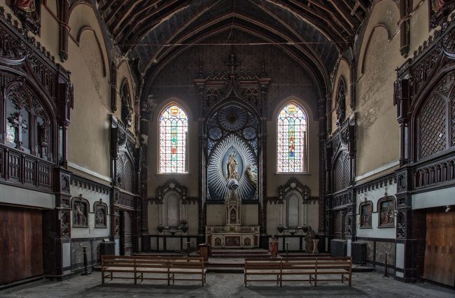 This small abandoned chapel was built in 1855, it was part of an orphanage. The gigantic painting above the entrance was made in 1863. The chapel was renovated in 1933, it witnesses history and art, the walls are full of 3D ornaments displaying the pelgrimage of Christ. Parts of the roof had fallen down, workers wiped them in a corner of the chapel. The good news is that the chapel is protected heritage, it will be probably be renovated and connected to a new building.