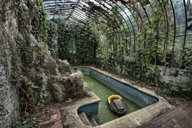 This abandoned greenhouse with barns lays on a big domain in front of an old baron’s castle. He can stay there, but soon the front barnyard part will become public domain, local shops will be opened in the barns, visitors can buy local products and walk around. Many tiles were decorated with plants, the kitchen, bathroom and even the nice chapel. This location had somewhat of a fairytale feeling.